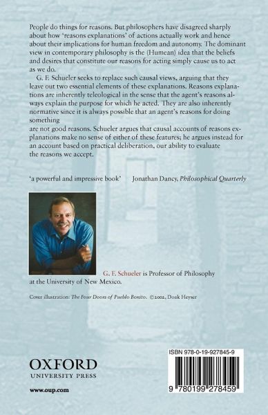 People do things for reasons. But philosophers have disagreed sharply about how 'reasons explanations' of actions actually work and hence about their implications for human freedom and autonomy. The dominant view in contemporary philosophy is the (Humean) idea that the beliefs and desires that constitute our reasons for acting simply cause us to act as we do. Fred Schueler seeks to replace such causal views, arguing that they leave out two essential elements of these explanations. Reasons explanations are inherently teleological in the sense that the agent's reasons always explain the purpose for which he acted. They are also inherently normative since it is always possible that an agent's reasons for doing something are not good reasons. Schueler argues that causal accounts of reasons explanations make no sense of either of these features; he argues instead for an account based on practical deliberation, our ability to evaluate the reasons we accept.