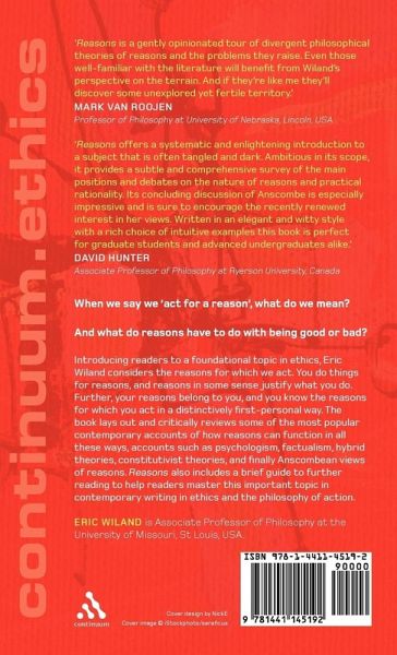When we say we 'act for a reason', what do we mean? And what do reasons have to do with being good or bad? Introducing readers to a foundational topic in ethics, Eric Wiland considers the reasons for which we act. You do things for reasons, and reasons in some sense justify what you do. Further, your reasons belong to you, and you know the reasons for which you act in a distinctively first-personal way. Wiland lays out and critically reviews some of the most popular contemporary accounts of how reasons can function in all these ways, accounts such as psychologism, factualism, hybrid theories, constitutivist theories, and finally Anscombean views of reasons. Reasons also includes a brief guide to further reading to help readers master this important topic in contemporary writing in ethics and the philosophy of action.