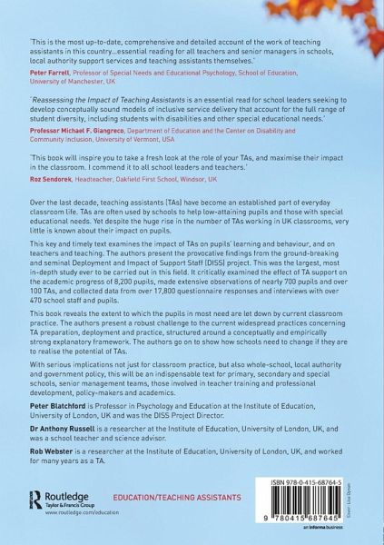 This key and timely text examines the impact of TAs on pupils' learning and behaviour, and on teachers and teaching. The authors present the provocative findings from the ground-breaking and seminal Deployment and Impact of Support Staff (DISS) project. This was the largest, most in-depth study ever to be carried out in this field. It critically examined the effect of TA support on the academic progress of 8,200 pupils, made extensive observations of nearly 700 pupils and over 100 TAs, and collected data from over 17,800 questionnaire responses and interviews with over 470 school staff and pupils.