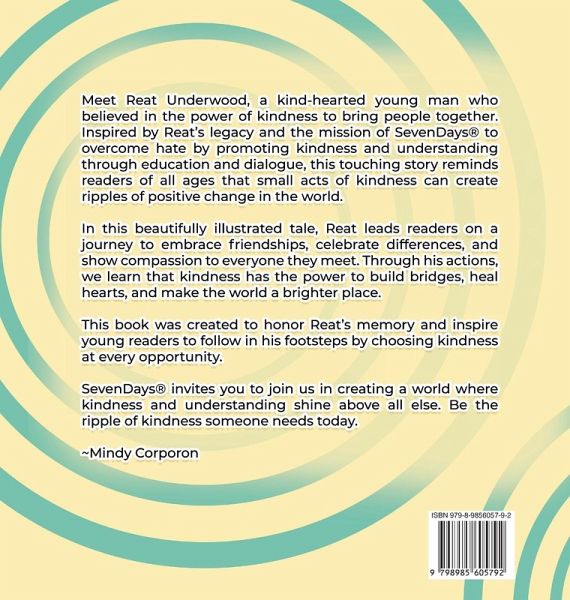 Meet Reat Underwood, a kind-hearted young man who believed in the power of kindness to bring people together. Inspired by Reat's legacy and the mission of Seven Days®¿ to overcome hate by promoting kindness and understanding through education and dialogue, this touching story reminds readers of all ages that small acts of kindness can create ripples of positive change in the world. In this beautifully illustrated tale, Reat leads readers on a journey to embrace friendships, celebrate differences, and show compassion to everyone they meet. Through his actions, we learn that kindness has the power to build bridges, heal hearts, and make the world a brighter place. This book was created to honor Reat's memory and inspire young readers to follow in his footsteps by choosing kindness at every opportunity. Seven Days®¿ invites you to join us in creating a world where kindness and understanding shine above all else. Be the ripple of kindness someone needs today. ~Mindy Corporon