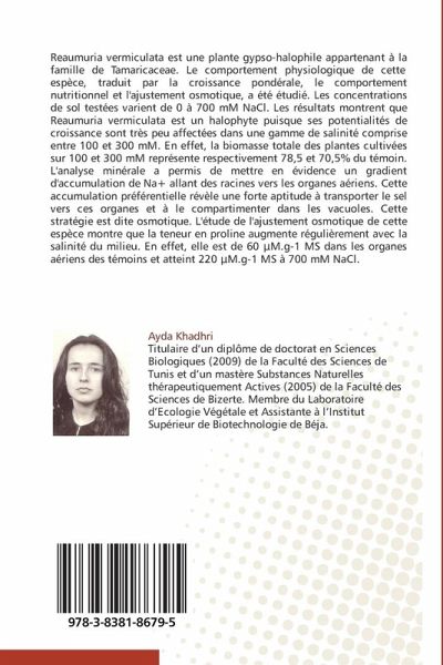Reaumuria vermiculata est une plante gypso-halophile appartenant à la famille de Tamaricaceae. Le comportement physiologique de cette espèce, traduit par la croissance pondérale, le comportement nutritionnel et l'ajustement osmotique, a été étudié. Les concentrations de sol testées varient de 0 à 700 mM NaCl. Les résultats montrent que Reaumuria vermiculata est un halophyte puisque ses potentialités de croissance sont très peu affectées dans une gamme de salinité comprise entre 100 et 300 mM. En effet, la biomasse totale des plantes cultivées sur 100 et 300 mM représente respectivement 78,5 et 70,5% du témoin. L'analyse minérale a permis de mettre en évidence un gradient d'accumulation de Na+ allant des racines vers les organes aériens. Cette accumulation préférentielle révèle une forte aptitude à transporter le sel vers ces organes et à le compartimenter dans les vacuoles. Cette stratégie est dite osmotique. L'étude de l'ajustement osmotique de cette espèce montre que la teneur en proline augmente régulièrement avec la salinité du milieu. En effet, elle est de 60 miM.g-1 MS dans les organes aériens des témoins et atteint 220 miM.g-1 MS à 700 mM NaCl.