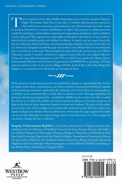 This is a memoir of my early childhood growing up in a remote and poor Nigerian village. My mother died when I was only 13 months old, leaving me exposed to a life without her nurturing and protective care. Moved from one foster home to another, I found love in some, indifference in others. My journey to adolescence was marked by loneliness and hardship. I experienced anger, shame, loneliness, misery, rebellion, sorrow and grief. This anguish was undeniably connected to the absence of my mother. I hated school, avoided people, and suffered in silence. It nearly tore me apart. Ironically, the very adversity which had been cause for paralyzing emptiness, became motivation for my rebound. I imagined myself through my mother's eyes. What kind of son would she have loved for me to become? This introspective quest led to the person I am now. When I became a priest, I started a ministry to support women like her and orphans like me. Today, ten years after incorporation in the U.S. as a 501c3 non-profit, the Divine Mercy International Widows and Orphans Organization (DMIWOO) is opening a 150-bed capacity medical center in my remote village of Obike. Indeed, life is about the things that happen to us as much as it is about the use we make of them.
