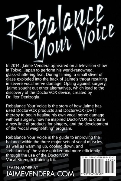 In 2014, Jaime Vendera appeared on a television show in Tokyo, Japan to perform his world-renowned, glass-shattering feat. During filming, a small sliver of glass exploded into the back of Jaime’s throat resulting in severe vocal nerve damage. Opting against surgery, Jaime sought out other alternatives, which lead to the discovery of the DoctorVOX device, created by Dr. Ilter Denizoglu. Rebalance Your Voice is the story of how Jaime has used DoctorVOX products and DoctorVOX (DVT) therapy to begin healing his own vocal nerve damage without surgery, how he inspired DoctorVOX to create a new line of products for singers, and the development of the "vocal weight-lifting" program. Rebalance Your Voice is the guide to improving the balance within the three major sets of vocal muscles, as well as warming up, cooling down, and "rebalancing" the voice quicker and more efficiently through the use of the DoctorVOX Vocal Strength Training Kit (nicknamed the VenderaVOX). Learn more at JaimeVendera.com