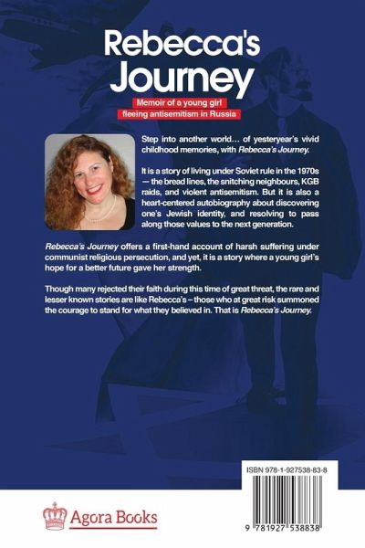 Step into another world ... of yesteryear's vivid childhood memories, with Rebecca's Journey. It is a story of living under Soviet rule in the 1970s - the bread lines, the snitching neighbours, KGB raids, and violent antisemitism. But it is also a heart-centered autobiography about discovering one's Jewish identity, and resolving to pass along those values to the next generation. Rebecca's Journey offers a first-hand account of harsh suffering under communist religious persecution, and yet, it is a story where a young girl's hope for a better future gave her strength. Though many rejected their faith during this time of great threat, the rare and lesser known stories are like Rebecca's - those who at great risk summoned the courage to stand for what they believed in. That is Rebecca's Journey.
