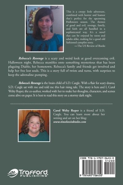 This is a creepy little adventure, combined with horror and humor that's perfect for the upcoming Halloween season. The themes of good and evil, revenge, family, and faith are all handled in a sophisticated way. It's a novel that can be enjoyed by teens and adults alike, making for a good old fashioned campfire story. ¿The US Review of Books Rebeccäs Revenge is a scary and weird look at good overcoming evil. Halloween night, Rebecca stumbles onto something mysterious that has been plaguing Diablo, her hometown. Rebeccäs family and friends get involved and help her free lost souls. This is a story full of twists and turns, with surprises to keep the adrenaline pumping. Rebeccäs Revenge is the brain child of S.D. Cargle. With a flair for scary drama, S.D. Cargle sat with me and told me this hair rising tale. The story is hers and I, Carol Welty Roper, the co-author, worked with her to make her thoughts, characters, and scenes come alive on paper. It is best to read this story on a stormy dark night.
