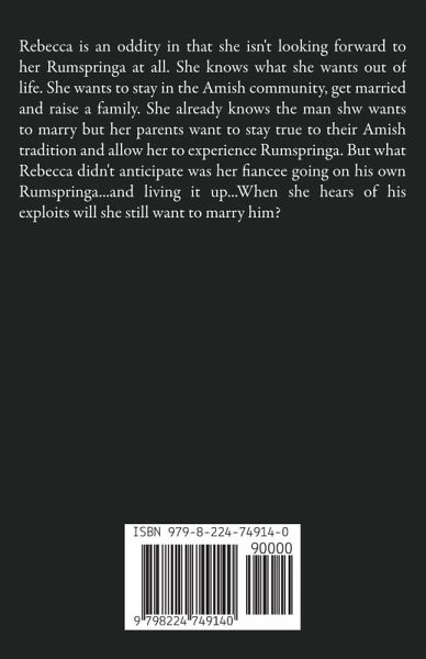 Rebecca is an oddity in that she isn't looking forward to her Rumspringa at all. She knows what she wants out of life. She wants to stay in the Amish community, get married and raise a family. She already knows the man shw wants to marry but her parents want to stay true to their Amish tradition and allow her to experience Rumspringa. But what Rebecca didn't anticipate was her fiancee going on his own Rumspringa...and living it up...When she hears of his exploits will she still want to marry him?