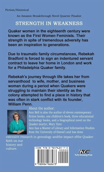 Quaker women in the eighteenth century were known as the First Women Feminist. Their strength in spite of tremendous adversity has been an inspiration to generations to come. Due to traumatic family circumstances, Rebekah Bradford is forced to sign an indentured servant contract to leave her home in London and work for a Philadelphia Quaker family. Rebekah's journey through life takes her from servanthood, to wife and mother and businesswoman during a period when Quakers were struggling to maintain their identity as the colony attempted to find its place in history that was often in stark conflict with its founder, William Penn. An Amazon Breakthrough Novel Quarter finalist.