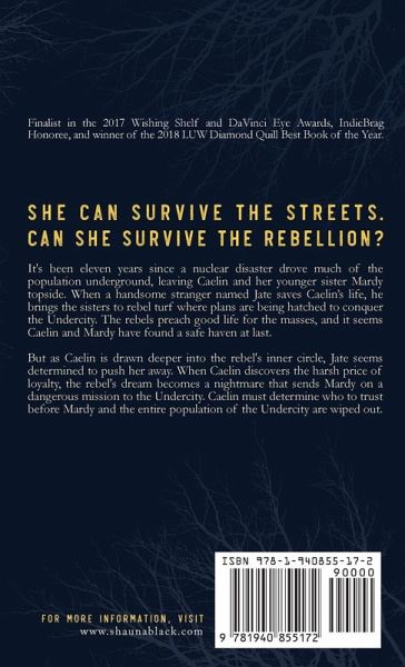 She can survive the streets, but can she survive the rebellion? It's been 11 years since a nuclear disaster drove much of the population underground, leaving Caelin and her younger sister Mardy topside. When a handsome stranger named Jate saves Caelin’s life, he brings the sisters to rebel turf where plans are being hatched to conquer the Undercity. The rebels preach good life for the masses, and it seems Caelin and Mardy have found a safe haven at last. But as Caelin is drawn deeper into the rebel's inner circle, Jate seems more determined to push her away. When Caelin discovers the harsh price of loyalty, the rebel's dream becomes a nightmare that sends Mardy on a dangerous mission to the Undercity. Caelin must determine who to trust before Mardy and the entire population of the Undercity are wiped out. Finalist in the 2017 Wishing Shelf and DaVinci Eye Awards, IndieBrag Honoree, and winner of the 2018 LUW Diamond Quill Best Book of the Year!
