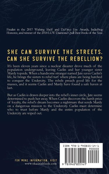 She can survive the streets, but can she survive the rebellion? It's been 11 years since a nuclear disaster drove much of the population underground, leaving Caelin and her younger sister Mardy topside. When a handsome stranger named Jate saves Caelin’s life, he brings the sisters to rebel turf where plans are being hatched to conquer the Undercity. The rebels preach good life for the masses, and it seems Caelin and Mardy have found a safe haven at last. But as Caelin is drawn deeper into the rebel's inner circle, Jate seems more determined to push her away. When Caelin discovers the harsh price of loyalty, the rebel's dream becomes a nightmare that sends Mardy on a dangerous mission to the Undercity. Caelin must determine who to trust before Mardy and the entire population of the Undercity are wiped out. Finalist in the 2017 Wishing Shelf and DaVinci Eye Awards, IndieBrag Honoree, and winner of the 2018 LUW Diamond Quill Best Book of the Year!