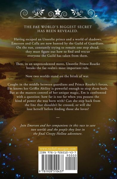 The fae world's biggest secret has been revealed ... Having escaped an Unseelie prince and a world of shadows, Emerson and Calla are now hunted by the Guild of Guardians. On the run, constantly trying to remain one step ahead, they must figure out how to find and rescue everyone the Guild has taken from them. Then, in an unprecedented move, Unseelie Prince Roarke breaks the fae realm's most important rule. Now two worlds stand on the brink of war. Caught in the middle between guardians and Prince Roarke's forces, Em knows her Griffin Ability is powerful enough to stop them both. But as she masters control of her unique magic, Em is confronted with a question: how far is too far when you possess the kind of power she was born with? Can she step back from the line that shouldn't be crossed, or will she lose herself before finding those she loves? Join Emerson and her companions in this race to save two worlds and the people they love in the final Creepy Hollow adventure!