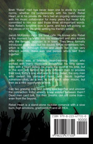 Brett "Rebel" Hart has never been one to abide by social norms, whether it's professionally with his band, Rebel Heart, or in his private life. He's had an ongoing relationship with his music collaborator for many years but never fully committed to him nor said those three all-important words. Now Rebel's longtime love is gone, and he's left picking up the pieces of his life while settling his friend's estate. Jacob McKinney owns the local cafe. He knows who Rebel is the moment he walks into his restaurant and also knows why the famous musician is in town. They were formally introduced years ago, but he doubts Rebel remembers him, which is fine. Although Rebel and Jacob live in two very different worlds, there was one person who's tied them together. John Kirby was a talented award-winning lyricist who worked with many musicians throughout his long career. Born with a heart defect, he made the most of his time, but in the end, left behind two very different men to process their loss. Kirby's one wish was to bring Rebel, the only man who owned his damaged heart, and Jacob together somehow—first, as a way to help each other mourn, but then as a new opportunity at love. Can two grieving men find lasting love together and uncover the connection Kirby already knew existed between them? Dead men can't talk, but their dreams can still come true—even from the beyond.