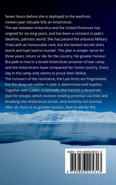 Seven hours before she is deployed to the warfront, sixteen-year old Jade kills an Antarctican. The war between Antarctica and the United Provinces has reigned for six long years, and has been a constant in Jade’s idealistic, patriotic world. She has passed the arduous Military Trials with an honourable rank, but the twisted secrets she’s learnt and kept lead to murder. The plan is simple: serve for three years, return or die for the country. No greater honour. But Jade is now in a brutal Antarctican prisoner-of-war camp and the Antarcticans have conquered her home country. Every day in the camp only seems to prove their defeat. The rumours of the resistance, the Last Army are fragmented, but the deep-set soldier in Jade is determined and hopeful. Together with Calder, a comrade, she hatches a desperate plan for escape, which involves stealing potential vaccines and breaking into Antarctican prison, and certainly not survival. After all, there is no greater honour, than to die for the country.