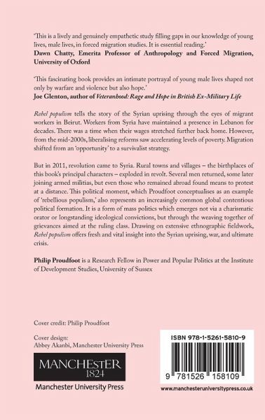 Rebel populism is an ethnography of Syrian migrant workers in Lebanon during the Syrian uprising and civil war. It documents the rise and fall of the revolution from the perspective of ordinary men. It explores the role of economic transformation, new technology, and masculinity in the development and practice of mass oppositional politics -- .