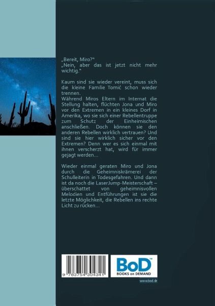 "Bereit, Miro?""Nein, aber das ist jetzt nicht mehr wichtig."Kaum sind sie wieder vereint, muss sich die kleine Familie Tomic schon wieder trennen.Während Miros Eltern im Internat die Stellung halten, flüchten Jona und Miro vor den Extremen in ein kleines Dorf in Amerika, wo sie sich einer Rebellentruppe zum Schutz der Einheimischen anschließen. Doch können sie den anderen Rebellen wirklich vertrauen? Und sind sie hier wirklich sicher vor den Extremen? Denn wer es sich einmal mit ihnen verscherzt hat, wird für immer gejagt werden...Wieder einmal geraten Miro und Jona durch die Geheimniskrämerei der Schulleiterin in Todesgefahren. Und dann ist da noch die LaserJump-Meisterschaft - überschattet von geheimnisvollen Melodien und Entführungen sind sie die letzte Möglichkeit, die Rebellen ins rechte Licht zu rücken...