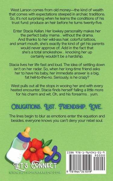 West Larson comes from old money-the kind of wealth that comes with expectations steeped in archaic traditions. So, it's not surprising when he learns the conditions of his trust fund: produce an heir before he turns twenty-five. Enter Stacia Kellan. Her lowkey personality makes her the perfect baby mama...without the drama. And thanks to her wild-ass hair, colorful tattoos, and smart mouth, she's exactly the kind of girl his parents would never approve of. Add in the fact that she's a total smokeshow...knocking her up certainly wouldn't be a hardship. Stacia lives her life fast and loud. The idea of settling down isn't on her radar. So, when her long-time friend asks her to have his baby, her immediate answer is a big, fat hell-to-the-no. Seriously, is he crazy? West pulls out all the stops in wooing her and with every heated encounter, Stacia finds herself falling a little more for his charm and wit. Oh, and his forearms...yum. Obligations. Lust. Friendship. Love. The lines begin to blur as emotions enter the equation and besides, everyone knows you can't deny your rebel soul.