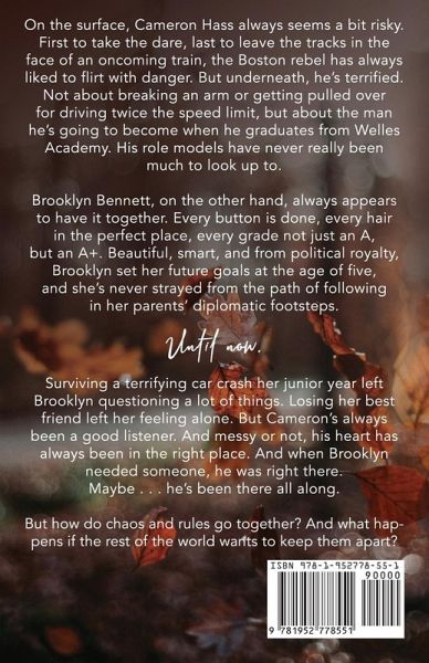On the surface, Cameron Hass always seems a bit risky. First to take the dare, last to leave the tracks in the face of an oncoming train, the Boston rebel has always liked to flirt with danger. But underneath, he's terrified. Not about breaking an arm or getting pulled over for driving twice the speed limit, but about the man he's going to become when he graduates from Welles Academy. His role models have never really been much to look up to. Brooklyn Bennett, on the other hand, always appears to have it together. Every button is done, every hair in the perfect place, every grade not just an A, but an A+. Beautiful, smart, and from political royalty, Brooklyn set her future goals at the age of five, and she's never strayed from the path of following in her parents' diplomatic footsteps. Until now. Surviving a terrifying car crash her junior year left Brooklyn questioning a lot of things. Losing her best friend left her feeling alone. But Cameron's always been a good listener. And messy or not, his heart has always been in the right place. And when Brooklyn needed someone, he was right there. Maybe . . . he's been there all along. But how do chaos and rules go together? And what happens if the rest of the world wants to keep them apart?