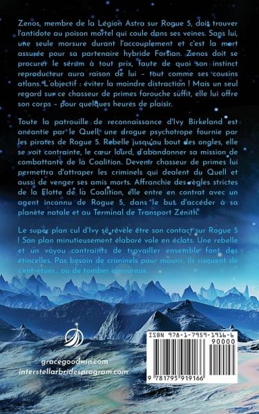 Zenos, membre de la Légion Astra sur Rogue 5, doit trouver l'antidote au poison mortel qui coule dans ses veines. Sans lui, une seule morsure durant l'accouplement et c'est la mort assurée pour sa partenaire hybride Forsian. Zenos doit se procurer le sérum à tout prix, faute de quoi son instinct reproducteur aura raison de lui - tout comme ses cousins atlans. L'objectif : éviter la moindre distraction ! Mais un seul regard sur ce chasseur de primes farouche suffit, elle lui offre son corps - pour quelques heures de plaisir. Toute la patrouille de reconnaissance d'Ivy Birkeland est anéantie par le Quell, une drogue psychotrope fournie par les pirates de Rogue 5. Rebelle jusqu'au bout des ongles, elle se voit contrainte, le c¿ur lourd, d'abandonner sa mission de combattante de la Coalition. Devenir chasseur de primes lui permettra d'attraper les criminels qui dealent du Quell et aussi de venger ses amis morts. Affranchie des règles strictes de la Flotte de la Coalition, elle entre en contrat avec un agent inconnu de Rogue 5, dans le but d'accéder à sa planète natale et au Terminal de Transport Zénith. Le super plan cul d'Ivy se révèle être son contact sur Rogue 5 ! Son plan minutieusement élaboré vole en éclats. Une rebelle et un voyou contraints de travailler ensemble font des étincelles. Pas besoin de criminels pour mourir, ils risquent de s'entretuer... ou de tomber amoureux.