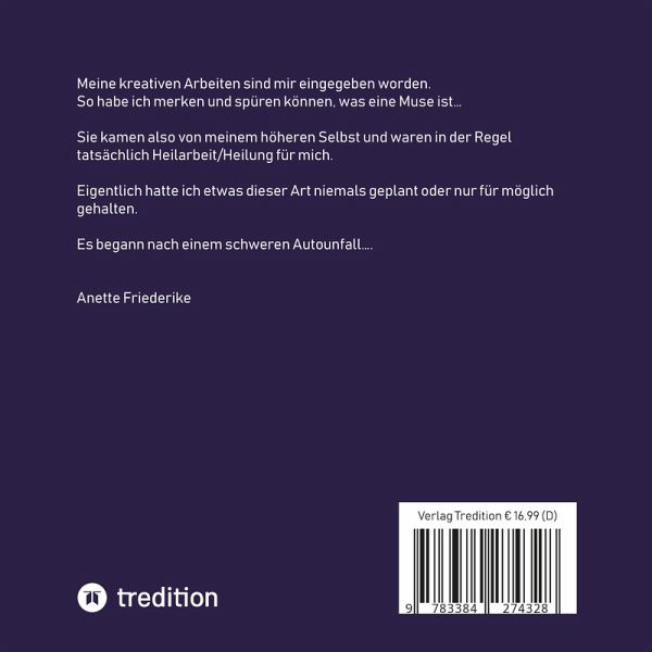 "Hänge Deinen Karren an einen Stern" - Leonardo da VinciDa war dieser Unfall, der neue Impulse in mein Leben brachte. Die weggeschobene Kreativität wollte wieder gelebt werden.Und so kamen in nächtlichen Sitzungen und am Tage durch Malen Worte zu mir, Verse, Und sie begleiteten mich, zeigten mir Wege auf in Stunden der Schwere und ebenso der Leichtigkeit. Beides gehört zu mir.Die Gedichte und Bilder brachten und bringen mir Heilung, Klarheit, zeigten mir Wege und sind Ausdruck meiner Verbundenheit mit der Natur und der Geistigkeit,"Muse"- ich hielt das für ein Konstrukt, aber es ist für mich Realität geworden. Und es zeigten sich mir wunderschöne Wege.Anette Friederike