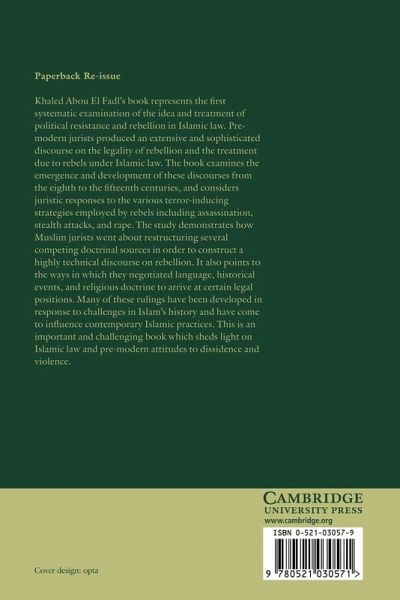 Khaled Abou El Fadl's book represents the first systematic examination of the idea and treatment of political resistance and rebellion in Islamic law. Pre-modern jurists produced an extensive and sophisticated discourse on the legality of rebellion and the treatment due to rebels under Islamic law. The book examines the emergence and development of these discourses from the eighth to the fifteenth centuries, and considers juristic responses to the various terror-inducing strategies employed by rebels--including assassination, stealth attacks and rape. The study demonstrates how Muslim jurists went about restructuring several competing doctrinal sources in order to construct a highly technical discourse on rebellion. Indeed many of these rulings may have a profound influence on contempoary practices. This is an important and challenging book which sheds light on the complexities of Islamic law, and pre-modern attitudes to dissidence and rebellion.