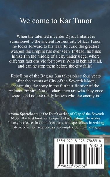 When the talented inventor Zyrus Imharet is summoned to the ancient fortress-city of Kar Tunor, he looks forward to his task; to build the greatest weapon the Empire has ever seen. Instead, he finds himself in the middle of a city under siege, where different factions vie for power. Who is behind it all, and can he stop them before the city falls? Rebellion of the Raging Sun takes place four years after the events of City of the Seventh Moon, continuing the story in the furthest frontier of the Ankuan Empire. Not all characters are who they once were, and no one really knows who the enemy is. Length: 400 pages.