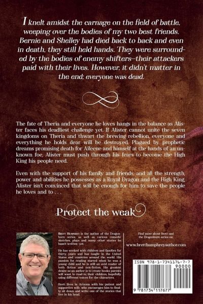 I knelt amidst the carnage on the field of battle, weeping over the bodies of my two best friends. Bernie and Shelley had died back to back and even in death, they still held hands. They were surrounded by the bodies of enemy shifters-their attackers paid with their lives. However, it didn't matter in the end; everyone was dead.* * * The fate of Theria and everyone he loves hangs in the balance as Alister faces his deadliest challenge yet. If Alister cannot unite the seven kingdoms on Theria and thwart the brewing rebellion, everyone and everything he holds dear will be destroyed. Plagued by prophetic dreams promising death for Aileene and himself at the hands of an unknown foe, Alister must push through his fears to become the High King his people need. Even with the support of his family and friends, and all the strength, power and abilities he possesses as a Royal Dragon and the High King, Alister isn't convinced that will be enough for him to save the people he loves and to - Protect the Weak