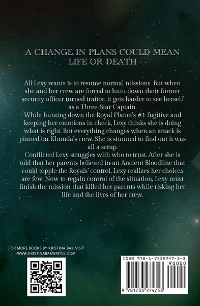 All Lexy wants is to resume normal missions. But when she and her crew are forced to hunt down their former security officer turned traitor, it gets harder to see herself as a Three-Star Captain. While hunting down the Royal Planet's #1 fugitive and keeping her emotions in check, Lexy thinks she is doing what is right. But everything changes when an attack is pinned on Khunda's crew. She is stunned to find out it was all a setup. Conflicted, Lexy struggles with whom to trust. After she is told that her parents believed in an Ancient Bloodline that could topple the Royals' control, Lexy realizes her choices are few. Now, to regain control of the situation, Lexy must finish the mission that killed her parents while risking her life and the lives of her crew.
