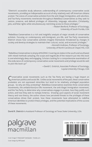 "Dietrich's accessible study advances understanding of contemporary conservative social movements, providing an indispensable account of why relatively well-off American citizens protest. The voices of conservative activists from the anti-illegal immigration, anti-abortion, and Tea Party movements reverberate throughout Rebellious Conservatives as they seek to restore, preserve, and defend privileges of citizenship, language, education, Christianity, jobs, and fetal rights while simultaneously restricting access to those privileges." - Robert Benford, Professor of Sociology, University of South Florida, USA