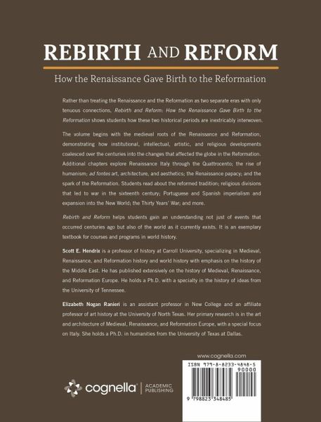 Rather than treating the Renaissance and the Reformation as two separate eras with only tenuous connections, Rebirth and Reform: How the Renaissance Gave Birth to the Reformation shows students how these two historical periods are inextricably interwoven. The volume begins with the medieval roots of the Renaissance and Reformation, demonstrating how institutional, intellectual, artistic, and religious developments coalesced over the centuries into the changes that affected the globe in the Reformation. Additional chapters explore Renaissance Italy through the Quattrocento; the rise of humanism; ad fontes art, architecture, and aesthetics; the Renaissance papacy; and the spark of the Reformation. Students read about the reformed tradition; religious divisions that led to war in the sixteenth century; Portuguese and Spanish imperialism and expansion into the New World; the Thirty Years' War; and more. Rebirth and Reform helps students gain an understanding not just of events that occurred centuries ago but also of the world as it currently exists. It is an exemplary textbook for courses and programs in world history.