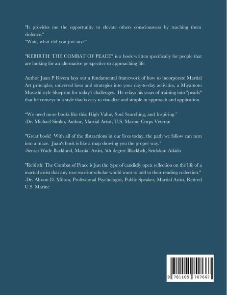 "REBIRTH: A COMBAT OF PEACE" is a book written specifically for people that are looking for alternative perspective on approaching life. Author Juan P Rivera lays out a fundamental framework of how to incorporate Martial Art principles, universal laws and strategies into your day-to-day activities. A Miyamoto Musashi style blueprint for today's challenges. He relays his years of training into "pearls" that he conveys in a style that is easy to visualize and simple in approach and application.