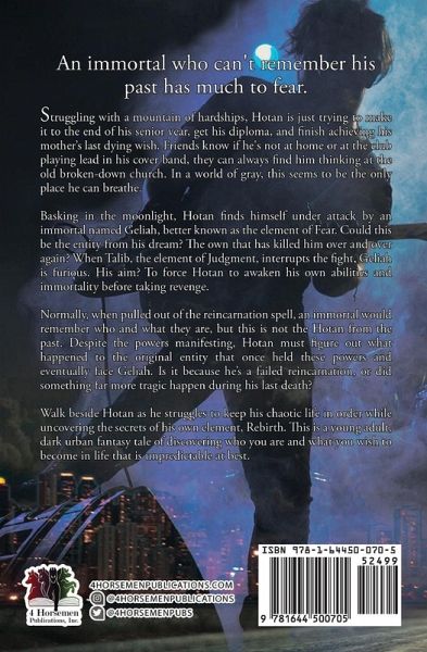 An immortal who can't remember his past has much to fear. Struggling with a mountain of hardships, Hotan is just trying to make it to the end of his senior year and get his diploma, satisfying his mother's dying wish. Friends know if he's not at home or at the club playing lead in his cover band, they can always find him thinking at the old broken-down church. In a world of gray, this is the only place he can breathe. Basking in the moonlight, Hotan finds himself under attack by an immortal named Geliah, better known as the element of Fear. Could this be the entity from his dream? The one that has killed him over and over again? When Talib, the element of Judgment, interrupts the fight, Geliah is furious. His aim? To force Hotan to awaken his own abilities and immortality before taking revenge. Normally, when pulled out of the reincarnation spell, an immortal remembers who and what they are, but this is not the Hotan from the past. Despite the powers manifesting, Hotan must figure out what happened to the original entity who once held these powers and eventually face Geliah. Is it because he's a failed reincarnation, or did something far more tragic happen during his last death? Walk beside Hotan as he struggles to keep his chaotic life in order while uncovering the secrets of his own element-Rebirth. This is a young adult, dark urban fantasy tale of discovering who you are and what you wish to become in life that is unpredictable at best.
