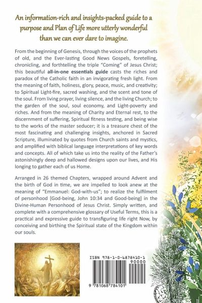 FULL COLOUR EDITION An information-rich and insights-packed practical guide to a purpose and plan of Life more utterly wonderful than we can ever dare to imagine. From the beginning of Genesis, through the voices of the prophets of old, and the Ever-lasting Good News Gospels, foretelling, chronicling, and forthtelling the triple "Coming" of Jesus Christ; this beautiful all-in-one essentials guide casts the riches and paradox of the Catholic faith in an invigorating fresh light. From the meaning of faith, holiness, glory, peace, music, and creativity; to Spiritual Light-fire, sacred washing, and the scent and tone of the soul. From living prayer, living silence, and the living Church; to the garden of the soul, soul economy, and Light-poverty and riches. And from the meaning of Charity and Eternal rest, to the discernment of suffering, Spiritual fitness testing, and being wise to the works of the master seducer; it is a treasure chest of the most fascinating and challenging insights, anchored in Sacred Scripture, illuminated by quotes from Church saints and mystics, and amplified with biblical language interpretations of key words and concepts. All of which take us into the reality of the Father's astonishingly deep and hallowed designs upon our lives, and His longing to gather each of us Home.Arranged in 26 themed Chapters, wrapped around Advent and the birth of God in time, we are impelled to look anew at the meaning of "Emmanuel: God-with-us"; to realize the fulfilment of personhood [God-being, John 10:34 and Good-being] in the Divine-Human Personhood of Jesus Christ. Simply written, and complete with a comprehensive glossary of Useful Terms, this is a practical and expressive guide to transfiguring life right Now, by conceiving and birthing the Spiritual state of the Kingdom within our souls.