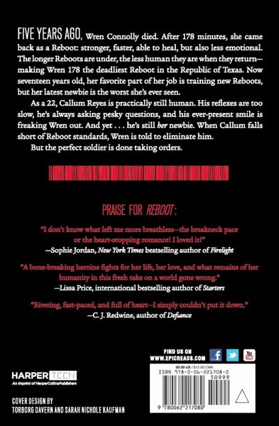 In this fast-paced dystopian thrill ride from New York Times-bestselling author Amy Tintera, perfect for fans of The Hunger Games, Legend, and Divergent, a seventeen-year-old girl returns from death as a Reboot and is trained as an elite crime-fighting soldier . . . until she is given an order she refuses to obey. Wren Connolly died five years ago, only to Reboot after 178 minutes. Now she is one of the deadliest Reboots around . . . unlike her newest trainee, Callum 22, who is practically still human. As Wren tries to teach Callum how to be a soldier, his hopeful smile works its way past her defenses. Unfortunately, Callum's big heart also makes him a liability, and Wren is ordered to eliminate him. To save Callum, Wren will have to risk it all. Wren's captivating voice and unlikely romance with Callum will keep readers glued to the page in Amy Tintera's high-stakes alternate reality, and diving straight into its action-packed sequel, Rebel. Don't miss Amy Tintera's new fantasy series, Ruined--full of epic stakes, sweeping romance, hidden identities, and scheming siblings.