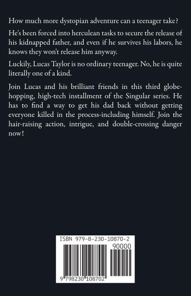How much more dystopian adventure can a teenager take? He's been forced into herculean tasks to secure the release of his kidnapped father, and even if he survives his labors, he knows they won't release him anyway. Luckily, Lucas Taylor is no ordinary teenager. No, he is quite literally one of a kind. Join Lucas and his brilliant friends in this third globe-hopping, high-tech installment of the Singular series. He has to find a way to get his dad back without getting everyone killed in the process-including himself. Join the hair-raising action, intrigue, and double-crossing danger now!