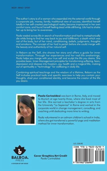 The author's story is of a woman who expanded into the external world through a corporate job, money, family, traditional view of success, identified herself totally in her self-created psychological reality, became imprisoned in her own comfort zone, and found herself feeling dead while still living. Life had to shake her up to bring her to awareness. Paola waded across life in search of transformation and had to metaphorically die while living to find her way back to joy and fulfillment; a death which was not of the body, but of her mind, conditioning, beliefs, judgments, thoughts and emotions. The concept of her had to perish before she could merge with the beauty and authenticity of her natural self. In Reborn as the Self, she shares her story and offers a guide for inner transformation. Through her experiences and her real-life awakenings, Paola helps you merge with your true self and sculpt the life you desire. She provides basic, Inner-Management principles for transforming suffering, fears, depression and disease into freedom, joy, health and a magical life, making out of spirituality a "technology" for wellbeing in daily life. Combining spiritual teachings and the wisdom of a lifetime, Reborn as the Self includes practical tools and specific exercises to help you contain your thoughts, shed your conditioned identity, and become the creator of the life you desire.