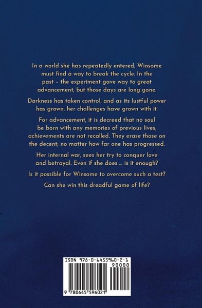 In a world she has repeatedly entered, Winsome must find a way to break the cycle. In the past - the experiment gave way to great advancement, but those days are long gone. Darkness has taken control, and as its lustful power has grown, her challenges have grown with it. For advancement, it is decreed that no soul be born with any memories of previous lives, achievements are not recalled. They erase those on the decent; no matter how far one has progressed. Her internal war, sees her try to conquer love and betrayal. Even if she does ... is it enough? Is it possible for Winsome to overcome such a test? Can she win this dreadful game of life?