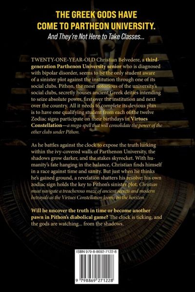 Twenty-one-year-old Christian Belvedere, a third-generation Parthenon University senior who is diagnosed with bipolar disorder, seems to be the only student aware of a sinister plot against the institution through one of its social clubs. Pithon, the most notorious of the university's social clubs, secretly houses ancient Greek deities intending to seize absolute power, first over the institution and next over the country. All it needs to complete its devious plan is to have one qualifying student from each of the twelve Zodiac signs participate on their birthdays in Virtues Constellation. This mega-spell will consolidate the power of the other clubs under Pithon. As he battles against the clock to expose the truth lurking within the ivy-covered walls of Parthenon University, the shadows grow darker, and the stakes skyrocket. With humanity's fate hanging in the balance, Christian finds himself in a race against time and sanity. But just when he thinks he's gained ground, a revelation shatters his resolve: his own zodiac sign holds the key to Pithon's sinister plot. Christian must navigate a treacherous maze of ancient secrets and modern betrayals as the Virtues Constellation looms on the horizon. Will he uncover the truth in time or become another pawn in Pithon's diabolical game? The clock is ticking, and the gods are watching... from the shadows.