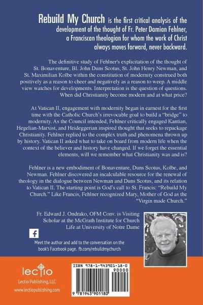 Rebuild My Church is the first critical analysis of the development of the thought of Fr. Peter Damian Fehlner, a Franciscan theologian for whom the work of Christ always moves forward, never backward. The definitive study of Fehlner's explicitation of the thought of St. Bonaventure, Bl. John Duns Scotus, St. John Henry Newman, and St. Maximilian Kolbe within the constitution of modernity construed both positively as a reason to cheer and negatively as a reason to weep. A middle view watches for developments. Interpretation is the question of questions. When did Christianity become modern and at what price? At Vatican II, engagement with modernity began in earnest for the first time with the Catholic Church's irrevocable goal to build a "bridge" to modernity. As the Council intended, Fehlner critically engaged Kantian, Hegelian-Marxist, and Heideggerian inspired thought that seeks to repackage Christianity. Fehlner replied to the complex truth and phenomena thrown up by history. Vatican II asked what to take on board from modern life when the context of the believer and history have changed. If we forget the essential elements, will we remember what Christianity was and is? Fehlner is a new embodiment of Bonaventure, Duns Scotus, Kolbe, and Newman. Fehlner discovered an incalculable resource for the renewal of theology in the dialogue between Newman and Duns Scotus, and its relation to Vatican II. The starting point is God's call to St. Francis: "Rebuild My Church." Like Francis, Fehlner recognized Mary, Mother of God as the "Virgin made Church."