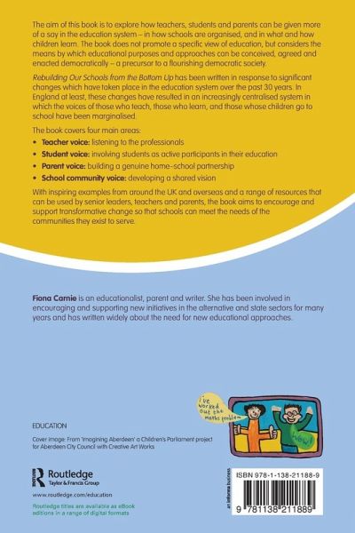 The aim of this book is to explore how teachers, students and parents can be given more of a say in the education system - in how schools are organised, and in what and how children learn. The book does not promote a specific view of education, but considers the means by which educational purposes and approaches can be conceived, agreed and enacted democratically - a precursor to a flourishing democratic society. Rebuilding Our Schools from the Bottom Up has been written in response to significant changes which have taken place in the education system over the past 30 years. In England at least, these changes have resulted in an increasingly centralised system in which the voices of those who teach, those who learn, and those whose children go to school have been marginalised. The book covers four main areas: Teacher voice: listening to the professionals Student voice: involving students as active participants in their education Parent voice: building a genuine home-school partnership School community voice: developing a shared vision With inspiring examples from around the UK and overseas and a range of resources that can be used by senior leaders, teachers and parents, the book aims to encourage and support transformative change so that schools can meet the needs of the communities they exist to serve.