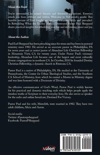 You're surrounded by ruined dreams and shattered aspirations. Enemies attack you from without and within. Welcome to Nehemiah's world. This humble servant of God fought against overwhelming odds and prevailed. In Rebuilding What the Enemy Almost Destroyed Pastor Paul Sheppard shares practical insights for rebuilding your life and reclaiming peace and joy. Paul Earl Sheppard has been preaching since his teens and has been in pastoral ministry since 1982. He served as an associate pastor in Philadelphia, PA for seven years and as senior pastor of Abundant Life Christian Fellowship in Mountain View, CA for twenty years. Under Pastor Paul's visionary leadership, Abundant Life became one of the largest and most culturally diverse congregations in northern CA. In October, 2010 he founded Destiny Christian Fellowship, a dynamic church in Fremont, CA. Pastor Paul is a native of Philadelphia, PA. He studied at the University of Pennsylvania, the Center for Urban Theological Studies, and the Southern CA School of Ministry, from which he earned a Master in Ministry degree and was later honored with a Doctorate of Divinity. An effective communicator of God's Word, Pastor Paul is widely known for his practical and dynamic teaching style which helps people apply the timeless truths of Scripture to their everyday lives. He also serves as speaker for the radio and online broadcast, Destined For Victory. Pastor Paul and his wife, Meredith, were married in 1982. They have two adult children, Alicia and Aaron.