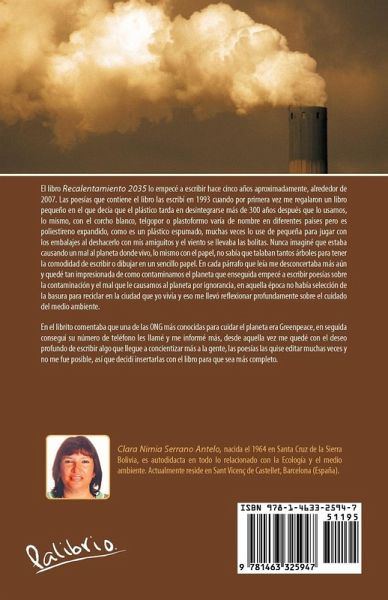 El libro Recalentamiento 2035 lo empecé a escribir hace cinco años aproximadamente, alrededor de 2008. Las poesías que contiene el libro las escribí en 1993 cuando por primera vez me regalaron un libro pequeño en el que decía cuantos años tardaba el plástico en desintegrarse: más de 300 años después que lo usamos, lo mismo, con el corcho blanco, telgopor o plastoformo varía de nombre en diferentes países pero es poliestireno espandido, como es un plástico espumado, muchas veces lo use de pequeña para jugar con los embalajes al deshacerlo con mis amiguitos y que el viento se llevara las bolitas, nunca imaginé que estaba causando un mal al planeta donde vivo. Lo mismo con el papel, no sabía que talaban tantos árboles para tener la comodidad de escribir o dibujar en un sencillo papel, en cada párrafo que leía me desconcertaba más aun y quedé tan impresionada de como contaminamos el planeta que enseguida empecé a escribir poesías sobre la contaminación y el mal que le causamos al planeta por ignorancia, en aquella época no había selección de la basura para reciclar en la ciudad que yo vivía y eso me dolió más aun. En el librito comentaba que una de las ONG más conocidas para cuidar el planeta era Greenpeace, en seguida conseguí su número de teléfono les llamé y me informé más aun, desde aquella vez me quedé con el deseo profundo de escribir algo que llegue a concientizar más a la gente, las poesías las quise editar muchas veces y no me fue posible, así que decidí insertarlas con el libro para que sea más completo.