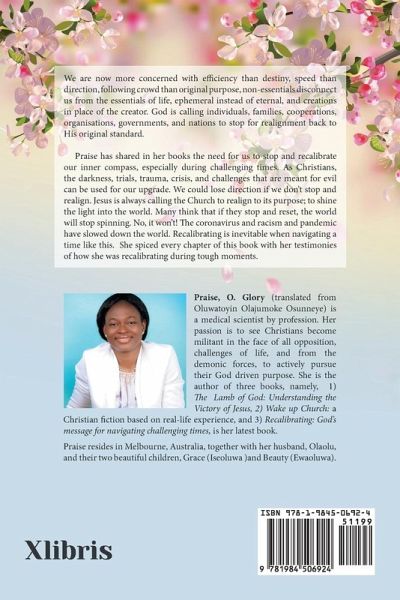 Praise, O. Glory (translated from Oluwatoyin Olajumoke Osunneye) is a medical scientist by profession. Her passion is to see Christians become militant in the face of all opposition, challenges of life, and from the demonic forces, to actively pursue their God driven purpose. She is the author of three books, namely, 1) The Lamb of God: Understanding the Victory of Jesus, 2) Wake up Church a Christian fiction based on real-life experience, and 3) Recalibrating: God's message for navigating challenging times, is her latest book. Praise resides in Melbourne, Australia, together with her husband, Olaolu, and their two beautiful children, Grace (Iseoluwa )and Beauty (Ewaoluwa).