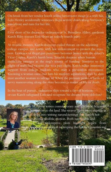 On break from her vendor booth selling bittersweet swags at a craft fair, Lolo Henley accidentally witnesses illegal activity down along Atchison's waterfront and runs for her life. Ever short of his dream for ordination at St. Benedicts Abbey, gardener Karch Riley rescues Lolo from an unholy search party. As trouble mounts, Karch discovers veiled threats on the adjoining college campus and teams with law enforcement to protect the innocent. Evidence of illegal gun purchases becomes linked with the abbey's Vicar Copley, Karch's harsh boss. Trouble deepens when human trafficking emerges as the ring's source of funding. Sensitive to the plight of trafficked victims due to a past slight, Karch rallies awareness support from college students who start a prevention movement. Knowing a woman once cost him his ministry aspirations, does he dare trust another woman to salvage it? When the pressure peaks, a battle of savvy maneuvering along the river becomes a matter of life or death. In the heat of pursuit, ordination slips toward a far-off horizon- or can Karch safeguard Lolo and recapture his dreams from oblivion?