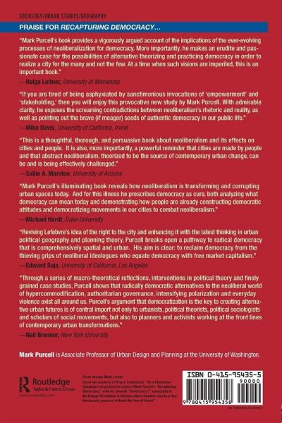Recapturing Democracy is a short yet synoptic introduction to urban democracy in our era of political neoliberalism and economic globalization. Combining an original argument with a number of case studies, Mark Purcell explores the condition of democracy in contemporary Western cities. Whereas many scholars focus on what Purcell calls "procedural democracy" - i.e., electoral politics and access to it - he instead assesses "substantive democracy." By this he means the people's ability to have some say over issues of social justice, material well being, and economic equality. Neoliberalism, which advocates a diminished role for the state and increasing power for mobile capital, has diminished substantive democracy in recent times, he argues. He looks at case studies where this has occurred and at others that show how neoliberalism can be resisted in the name of substantive democracy. Ultimately, he utilizes Henri Lefebvre's notion of "the right to the city," which encompasses substantive as well as procedural democracy for ordinary urban citizens.