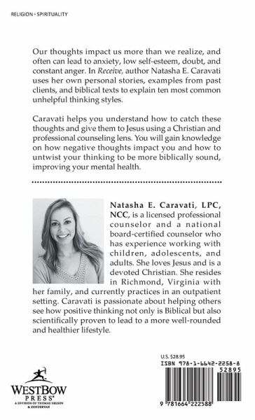 Our thoughts impact us more than we realize, and often can lead to anxiety, low self-esteem, doubt, and constant anger. In Receive, author Natasha E. Caravati uses her own personal stories, examples from past clients, and biblical texts to explain ten most common unhelpful thinking styles. Caravati helps you understand how to catch these thoughts and give them to Jesus using a Christian and professional counseling lens. You will gain knowledge on how negative thoughts impact you and how to untwist your thinking to be more biblically sound, improving your mental health.
