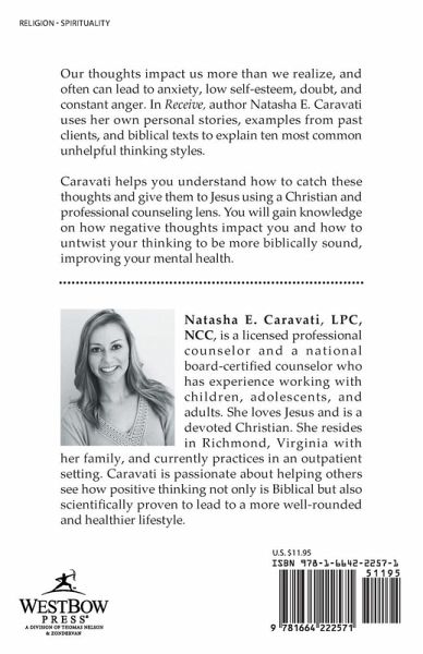 Our thoughts impact us more than we realize, and often can lead to anxiety, low self-esteem, doubt, and constant anger. In Receive, author Natasha E. Caravati uses her own personal stories, examples from past clients, and biblical texts to explain ten most common unhelpful thinking styles. Caravati helps you understand how to catch these thoughts and give them to Jesus using a Christian and professional counseling lens. You will gain knowledge on how negative thoughts impact you and how to untwist your thinking to be more biblically sound, improving your mental health.