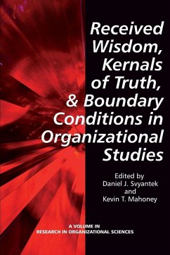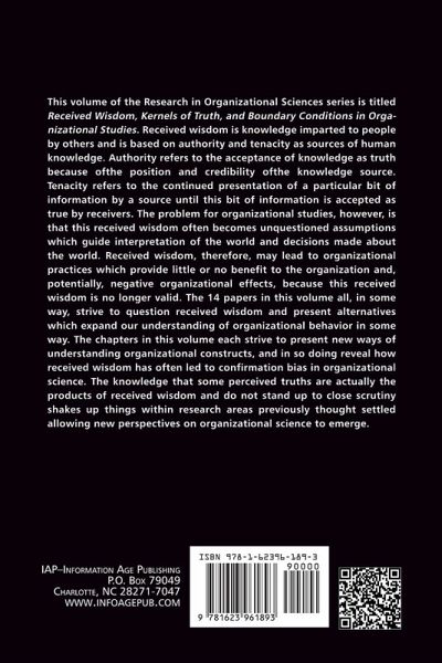 This volume of the Research in Organizational Sciences is entitled "Received Wisdom, Kernels of Truth, and Boundary Conditions in Organizational Studies". Received wisdom is knowledge imparted to people by others and is based on authority and tenacity as sources of human knowledge. Authority refers to the acceptance of knowledge as truth because of the position and credibility of the knowledge source. Tenacity refers to the continued presentation of a particular bit of information by a source until this bit of information is accepted as true by receivers. The problem for organizational studies, however, is that this received wisdom often becomes unquestioned assumptions which guide interpretation of the world and decisions made about the world. Received wisdom, therefore, may lead to organizational practices which provide little or no benefit to the organization and, potentially, negative organizational effects, because this received wisdom is no longer valid. The 14 papers in this volume all, in some way, strive to question received wisdom and present alternatives which expand our understanding of organizational behavior in some way. The chapters in this volume each strive to present new ways of understanding organizational constructs, and in so doing reveal how received wisdom has often led to confirmation bias in organizational science. The knowledge that some perceived truths are actually the products of received wisdom and do not stand up to close scrutiny shakes up things within research areas previously thought settled allowing new perspectives on organizational science to emerge.