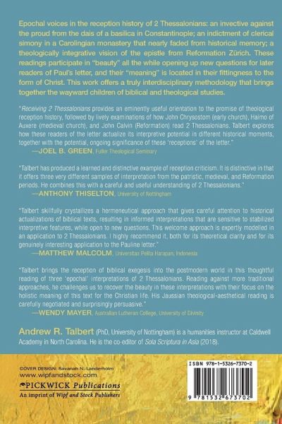 Epochal voices in the reception history of 2 Thessalonians: an invective against the proud from the dais of a basilica in Constantinople; an indictment of clerical simony in a Carolingian monastery that nearly faded from historical memory; a theologically integrative vision of the epistle from Reformation Zurich. These readings participate in ""beauty"" all the while opening up new questions for later readers of Paul's letter, and their ""meaning"" is located in their fittingness to the form of Christ. This work offers a truly interdisciplinary methodology that brings together the wayward children of biblical and theological studies.