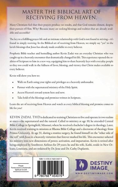 Master the Biblical art of receiving from Heaven. Many Christians feel that their prayers produce no results, and that God remains distant, despite their pursuit of Him. Why? Because many are seeking blessings and realities that are already available and accessible! The key to a fulfilling prayer life and an intimate relationship with God is not found in striving—it’s found in simply receiving. In the Biblical art of receiving from Heaven, we simply say "yes" to the lavish blessings that Jesus has already made available to every believer. Prophetic Bible teacher and bestselling author Kevin Zadai was an everyday Christian who was caught up in a heavenly encounter that dramatically changed his life. This experience opened the realities of Scripture to him in a new way, equipping him to share heavenly keys with everyday people so they too could walk in the fullness of favor, blessing, and victory that Christ makes available to every believer. Kevin will show you how to: Walk on Earth using your rights and privileges as a heavenly ambassador. Partner with the supernatural ministry of the Holy Spirit. Access Heaven’s reward system here and now. Take hold of the blessings and promises written in Scripture. Learn the art of receiving from Heaven and watch as every biblical blessing and promise comes to life for you!