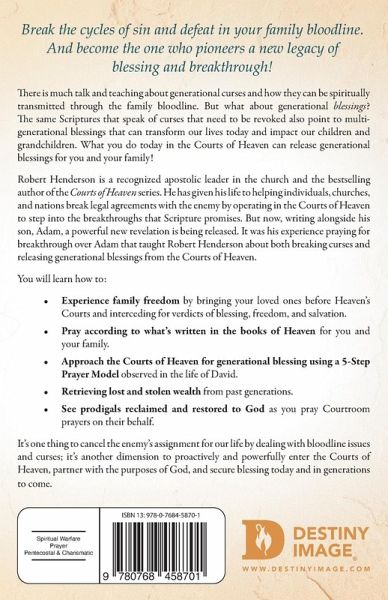 Break the cycles of sin and defeat in your family bloodline. And become the one who pioneers a new legacy of blessing and breakthrough! There is much talk and teaching about generational curses and how they can be spiritually transmitted through the family bloodline. But what about generational blessings? The same Scriptures that speak of curses that need to be revoked also point to multi-generational blessings that can transform our lives today and impact our children and grandchildren. What you do today in the Courts of Heaven can release generational blessings for you and your family! Robert Henderson is a recognized apostolic leader in the church and the bestselling author of the Courts of Heaven series. He has given his life to helping individuals, churches, and nations break legal agreements with the enemy by operating in the Courts of Heaven to step into the breakthroughs that Scripture promises. But now, writing alongside his son, Adam, a powerful new revelation is being released. It was his experience praying for breakthrough over Adam that taught Robert Henderson about both breaking curses and releasing generational blessings from the Courts of Heaven. You will learn how to: Experience family freedom by bringing your loved ones before Heaven's Courts and interceding for verdicts of blessing, freedom, and salvation. Pray according to what's written in the books of Heaven for you and your family. Approach the Courts of Heaven for generational blessing using a 5-Step Prayer Model observed in the life of David. Retrieving lost and stolen wealth from past generations. See prodigals reclaimed and restored to God as you pray Courtroom prayers on their behalf. It's one thing to cancel the enemy's assignment for our life by dealing with bloodline issues and curses; it's another dimension to proactively and powerfully enter the Courts of Heaven, partner with the purposes of God, and secure blessing today and in generations to come.