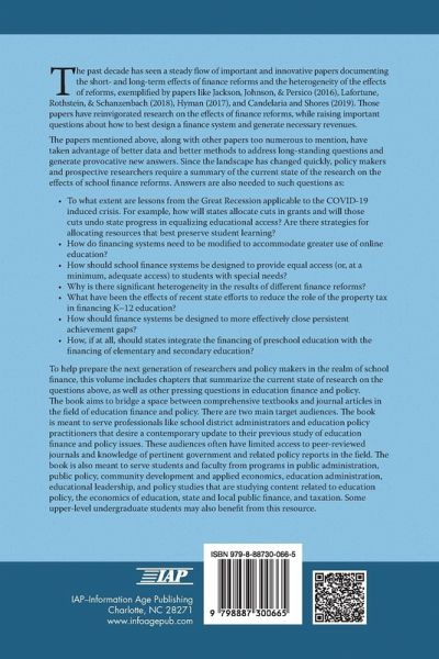 The past decade has seen a steady flow of important and innovative papers documenting the short- and long-term effects of finance reforms and the heterogeneity of the effects of reforms, exemplified by papers like Jackson, Johnson, & Persico (2016), Lafortune, Rothstein, & Schanzenbach (2018), Hyman (2017), and Candelaria and Shores (2019). Those papers have reinvigorated research on the effects of finance reforms, while raising important questions about how to best design a finance system and generate necessary revenues. The papers mentioned above, along with other papers too numerous to mention, have taken advantage of better data and better methods to address long-standing questions and generate provocative new answers. Since the landscape has changed quickly, policy makers and prospective researchers require a summary of the current state of the research on the effects of school finance reforms. To help prepare the next generation of researchers and policy makers in the realm of school finance, this volume includes papers that summarize the current state of research on the questions above, as well as other pressing questions in education finance and policy. The book aims to bridge a space between comprehensive textbooks and journal articles in the field of education finance and policy. There are two main target audiences. The book is meant to serve professionals like school district administrators and education policy practitioners that desire a contemporary update to their previous study of education finance and policy issues. These audiences often have limited access to peer reviewed journals and knowledge of pertinent government and related policy reports in the field. The book is also meant to serve students and faculty from programs in public administration, public policy, community development and applied economics, education administration, educational leadership and policy studies that are studying content related to education policy, the economics of education, state and local public finance, and taxation. Some upper-level undergraduate students may also benefit from this resource.